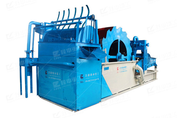 s先將物料放置在滾筒篩洗機(jī)內(nèi)部,電動(dòng)機(jī)經(jīng)減速機(jī)與滾筒裝置通過(guò)聯(lián)軸器連接在一起,驅(qū)動(dòng)滾筒裝置繞其軸線轉(zhuǎn)動(dòng),當(dāng)物料進(jìn)入滾筒裝置后,由于滾筒裝置的傾斜與轉(zhuǎn)動(dòng),使篩面上的物料翻轉(zhuǎn)與滾動(dòng),使合格物料經(jīng)滾筒后端底部的出料口排出,不合格的物料經(jīng)滾筒尾部的排料口排出,滾筒篩洗機(jī)內(nèi)部的物料通過(guò)溜槽排除,而物料進(jìn)而到輪式洗砂機(jī)內(nèi)部,輪式洗砂機(jī)工作時(shí),電機(jī)通過(guò)三角帶、減速機(jī)、齒輪減速后帶動(dòng)葉輪緩慢轉(zhuǎn)動(dòng),砂石有給料槽進(jìn)入洗槽中,在葉輪的帶動(dòng)下翻滾,并互相研磨,除去覆蓋砂石表面的雜質(zhì),同時(shí)破壞包覆砂粒的水汽層,以利于脫水,同時(shí)加水,形成強(qiáng)大水流,及時(shí)將雜質(zhì)及比重小的異物帶走,并從溢出口洗槽排出,完成清洗作用,干凈的砂石由葉片帶走,后砂石從旋轉(zhuǎn)的葉輪倒入出料槽,完成砂石的清洗作用,而輪式洗砂機(jī)本體的另一端設(shè)有振動(dòng)篩,輪式洗砂機(jī)本體內(nèi)部的驅(qū)動(dòng)電機(jī)帶動(dòng)輪斗轉(zhuǎn)動(dòng),輪斗內(nèi)物料落入振動(dòng)篩上的結(jié)構(gòu),振動(dòng)篩下方設(shè)有落水箱,落水箱內(nèi)部的物料通過(guò)運(yùn)行的渣漿泵輸入到旋流器內(nèi)部,而運(yùn)行的旋流器濃縮后的物料落入振動(dòng)篩的結(jié)構(gòu),而旋流器分離的水體進(jìn)入到回收水箱內(nèi)部,而回收水箱的水體流入到蓄水箱內(nèi)部,用于滾筒篩洗機(jī)本體內(nèi)部的清洗,這就是該滾筒篩洗一體機(jī)工作的整個(gè)過(guò)程。
